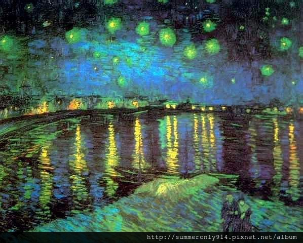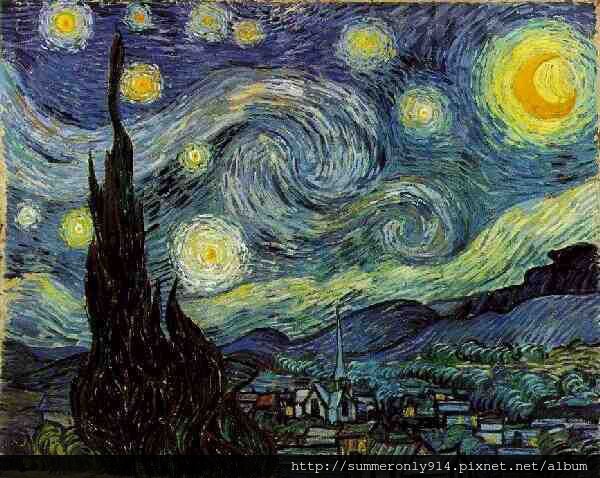 夜空中翻攪的漩雲是澎湃、錯亂的心,星與月都迷離地令人目眩,星空下靜謐的南法小鎮,卻有如心中的空洞,黑夜中的絲柏猙獰又孤獨,是向無盡夜空絕望的吶喊。